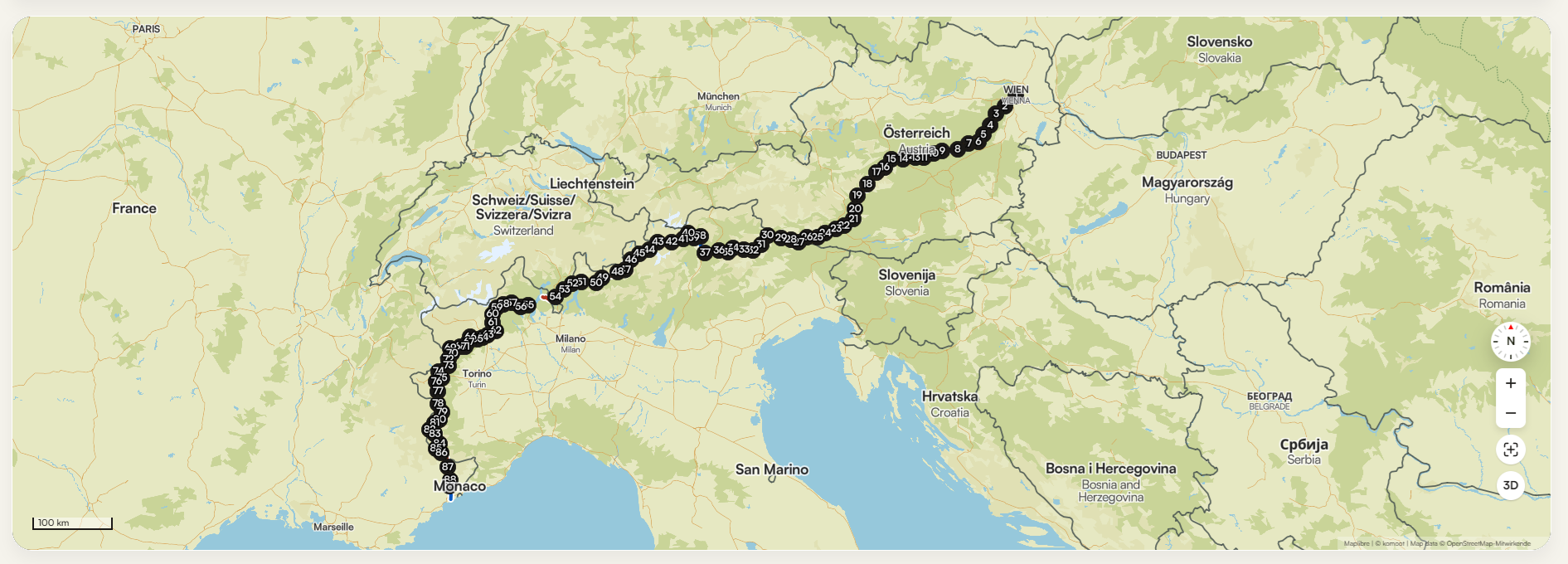 In den Westalpen des Piemont trifft der Weg auf die legendäre GTA (Grande Traversata delle Alpi) und folgt ihr entlang abgelegener Alpentäler, Almen und kleiner Dörfer, bis sich der Alpenbogen ein letztes Mal aufbäumt: durch die Seealpen / Alpes-Maritimes hinunter Richtung Küste. Und dann: Meeresluft. Nizza/Monaco.